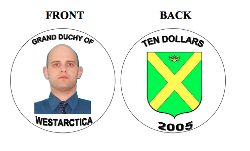 The 2005 $10 Westarctican Dollars coin was the third coin minted by the Central Bank and the first bearing a likeness of a person. It features an image of Grand Duke Travis on the obverse, which was created from a portrait session. The reverse provides a rare example of a color version of Westarctica's arms as they were in 2005.