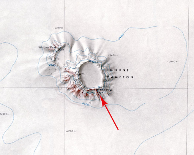 Map of Mount Hampton showing the location of Marks Peak.